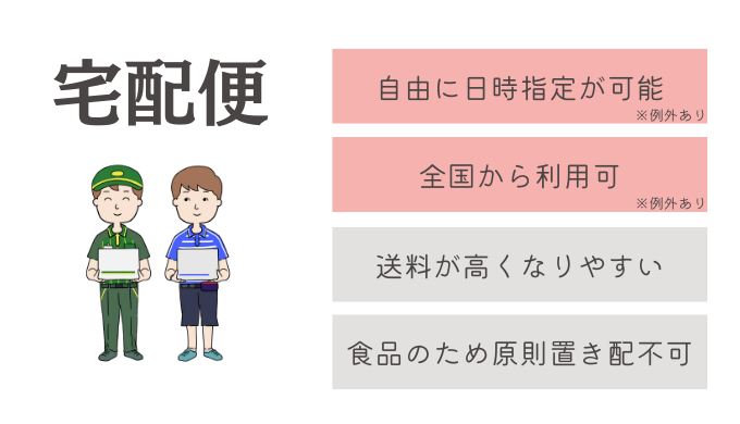 配送ルートが決まっているため、お届け日時は「○曜日の○時頃」と宅配会社側が指定します。
