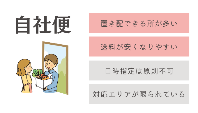 - 配達方法は「自社便」か「宅配(ヤマト運輸等)」か