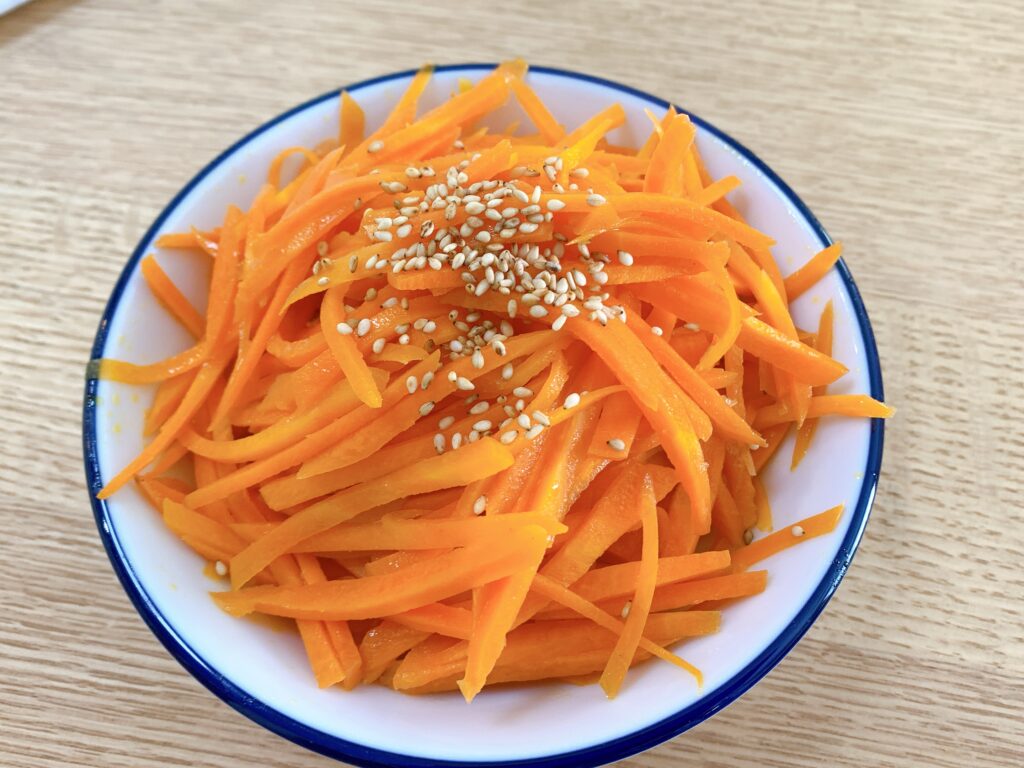 千切りしたにんじんをごま油で炒めて、酒と塩で味付け、白ごまを振ったシンプルなメニューです。