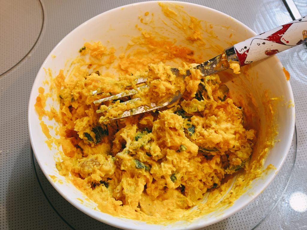 温野菜のかぼちゃは、フォークでつぶして、くるみを混ぜて、マヨネーズとしょうゆで和風サラダに。