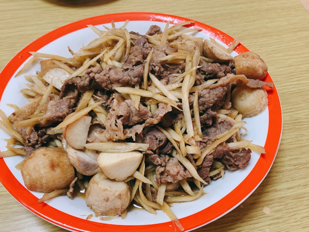 里芋とごぼうは、牛肉と一緒に炒めて、醤油・砂糖・みりんで甘辛炒めに。
