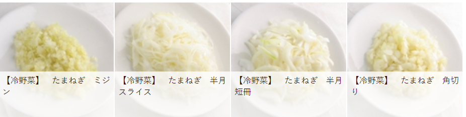例えば冷野菜のたまねぎなら、みじん切り、半月スライス、半月短冊、角切りの4つの調理方法が選べます。