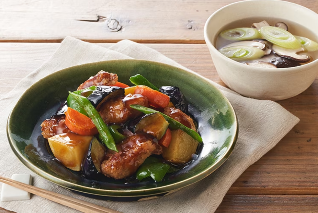 最近好評だったのはシェフメニューの鶏とさつまいもの甘辛和だれ。