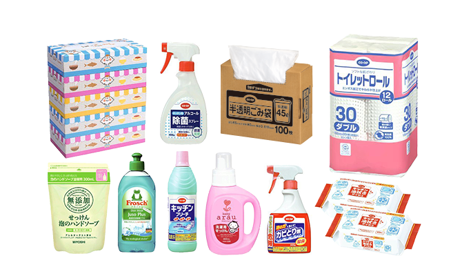 トイレットペーパー、ティッシュ、洗剤、シャンプー、ごみ袋などの日用品もだいたいなんでも揃っています。