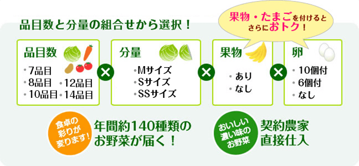 コースがたくさんあってややこしいですが基本的には「何種類の野菜が欲しいか」「1種あたりどのぐらい欲しいか→SS~M」「果物が欲しいか」「NG野菜を選びたいか」「特定産地の野菜が欲しいか」の5つのポイントで選びます。