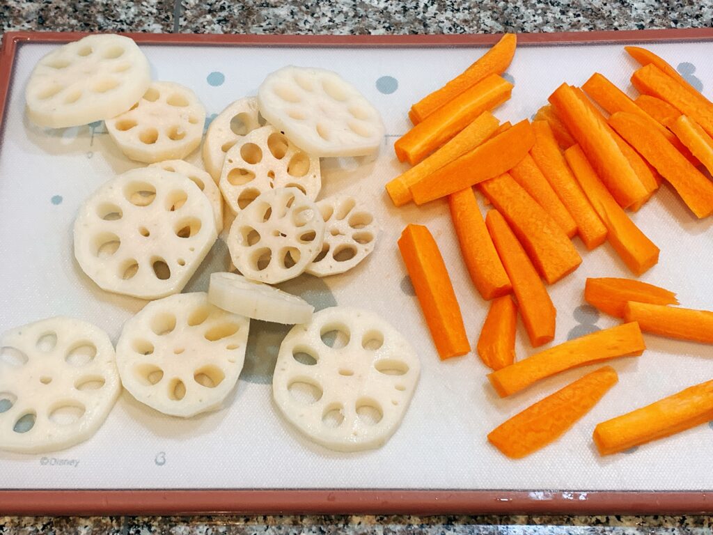 今回はお試しセットに入っていた、れんこん2個とにんじん1本で作ります。