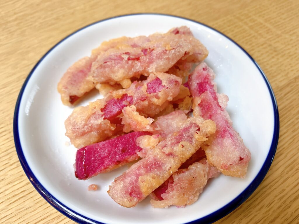 作り方は小麦粉、水、マヨネーズを2:1:1で混ぜてさっと衣づけして揚げ、塩をふるだけ。