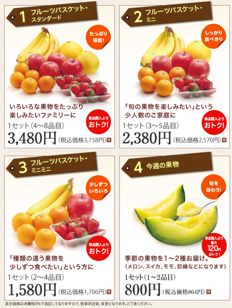 | 8種S・じゃが玉にんじん抜き 果物つき | 約8種 | 1~2種 | 2,948円 |