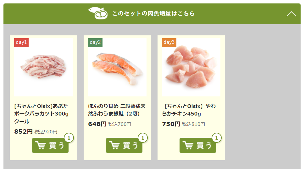 我が家はちゃんとOisixが自動でカートに入るコースを利用しているので、あとはかさ増し用の肉や魚を追加するだけ。