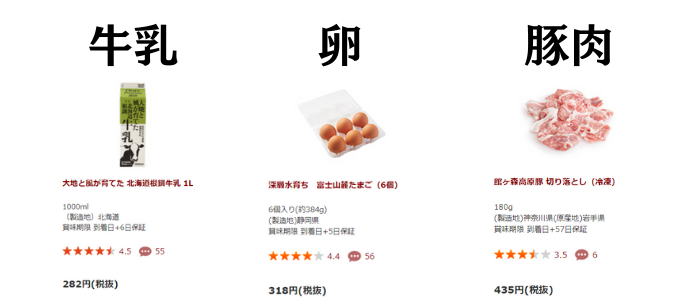 月額税込1,628円(隔週なら月額税込968円)で、注文ごとに牛乳・卵・パンなどの食品が毎回3品無料で貰えるんです。