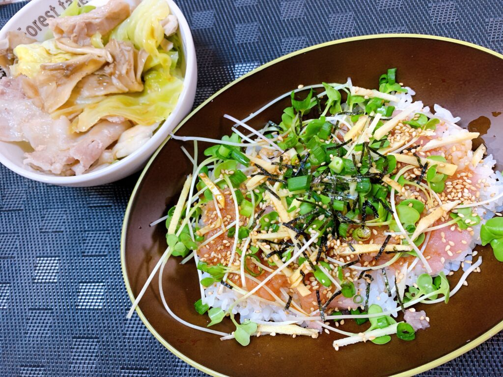 主菜はたっぷり薬味のまぐろすきみ丼。