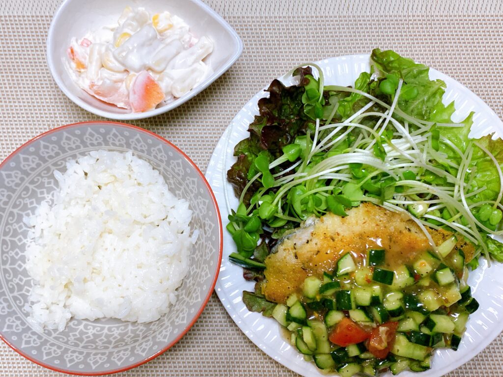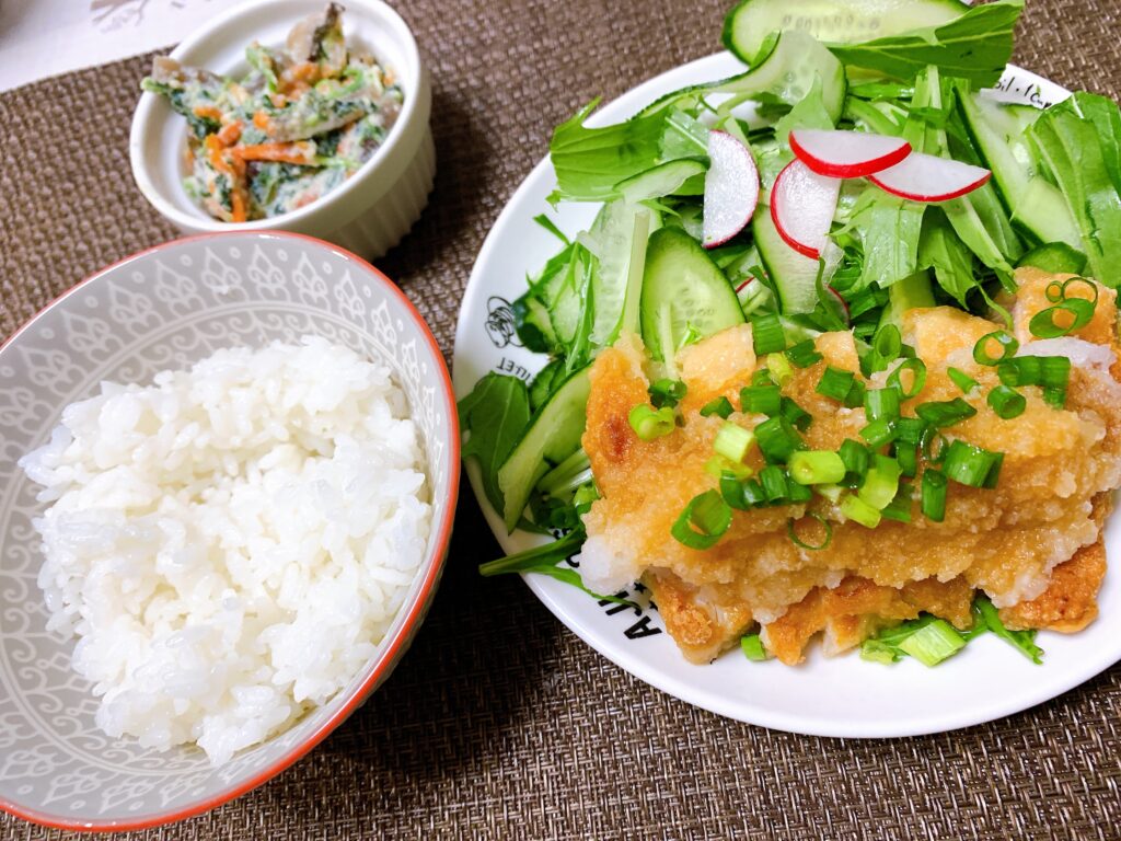 竜田揚げも揚げるだけの冷凍タイプで、サラダを作ったり、大根を下ろすだけで楽でした。